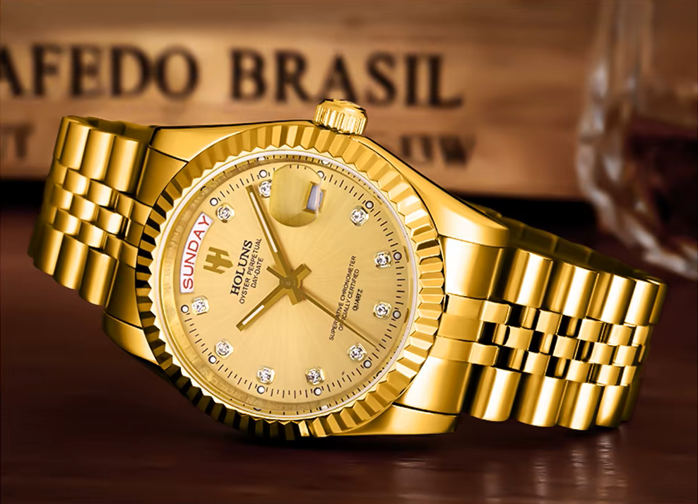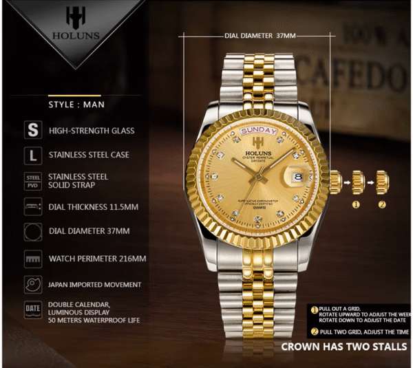 Elevate your style with the HOLUNS Men’s Luxury Quartz Watch, a refined timepiece designed for those who appreciate classic sophistication and modern functionality. Featuring a radiant gold dial adorned with diamond-like hour markers, this watch combines elegance with everyday practicality.
